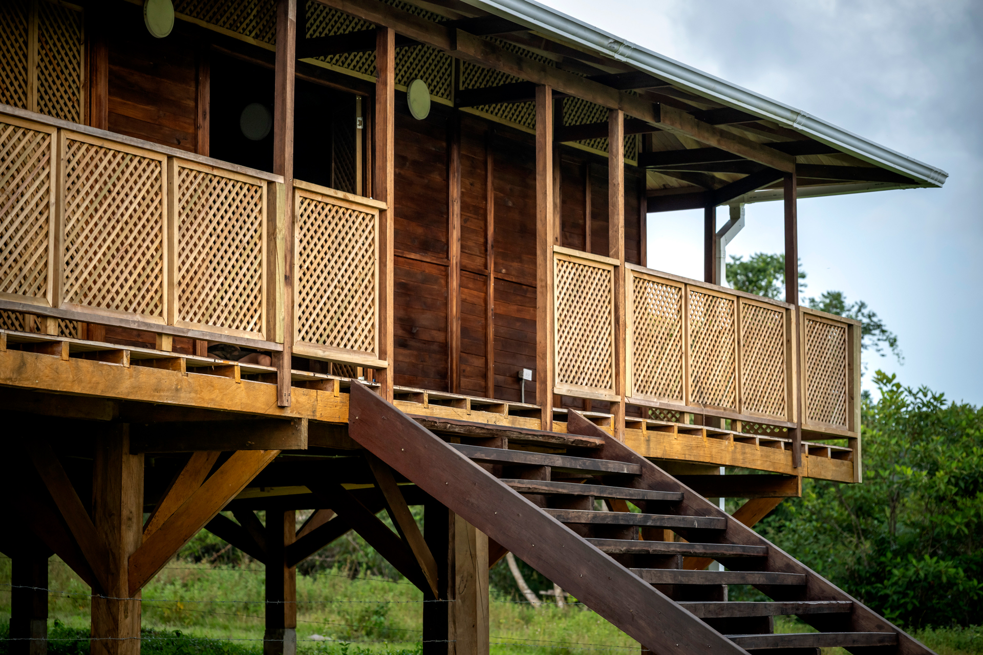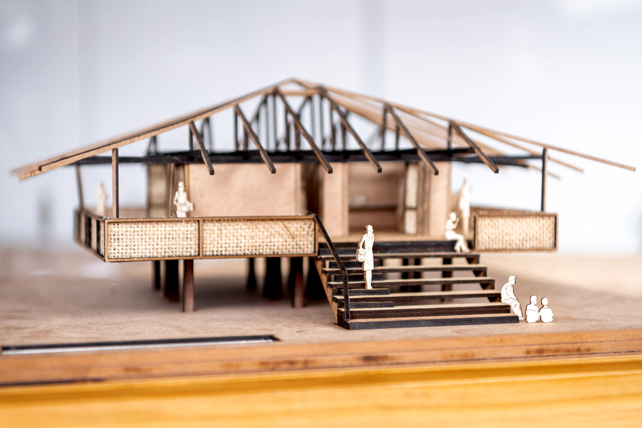 Espacio flexible para talleres y reuniones. Su diseño abierto favorece la ventilación y el encuentro. Combina materiales locales con sistemas prefabricados.